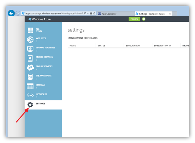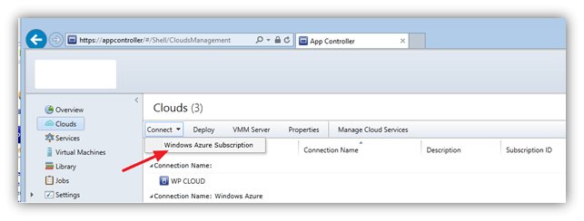 Now import the certificate (PFX) in App Controller. Open the App Controller portal, go to Clouds and click on Connect, Windows Azure Subscription: