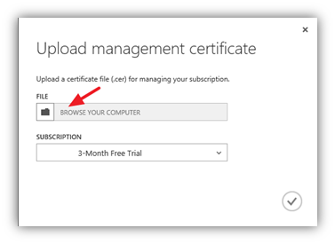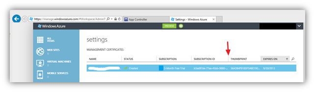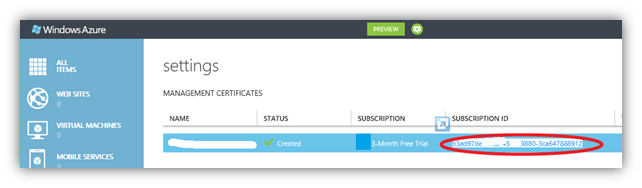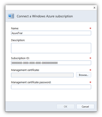 Fill in the necessary fields, paste the Subscription ID, browse for the .PFX certificate and fill in the password you used when exporting the certificate.