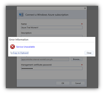 One problem I ran into when connecting Azure in App Controller, I got the error message:
