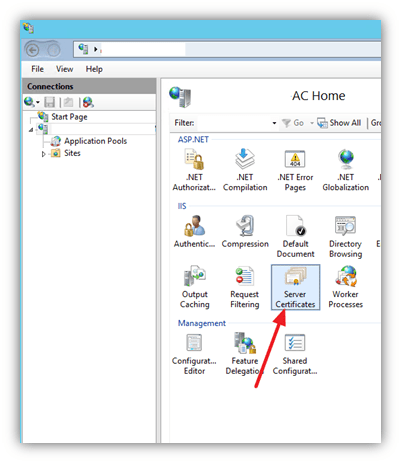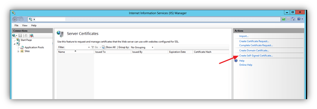 On the App Controller server open the IIS Management Console and create a Self-Signed Certificate.