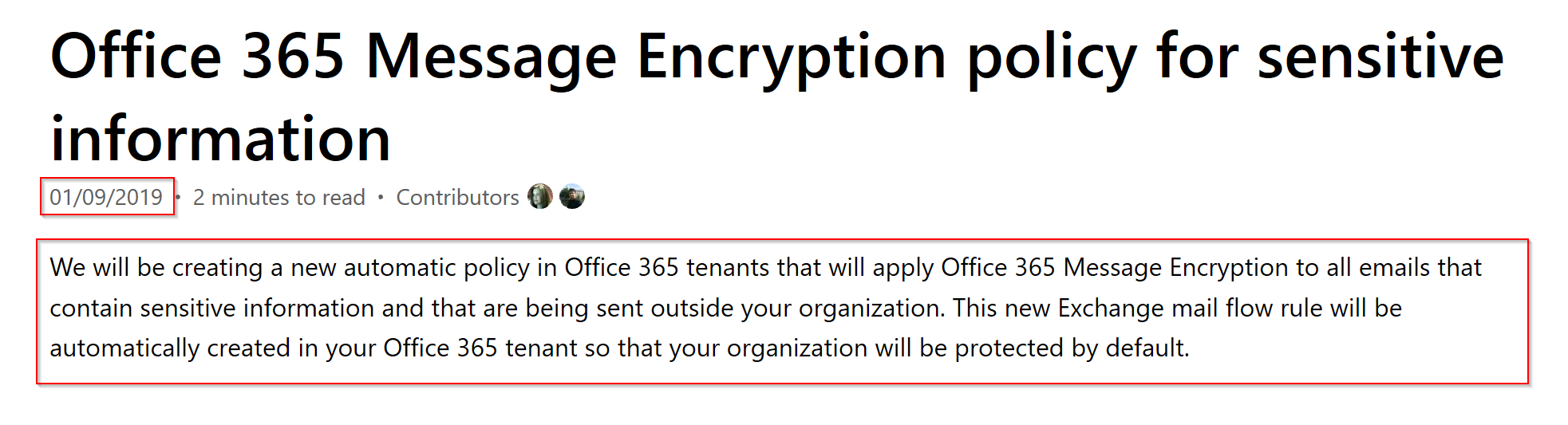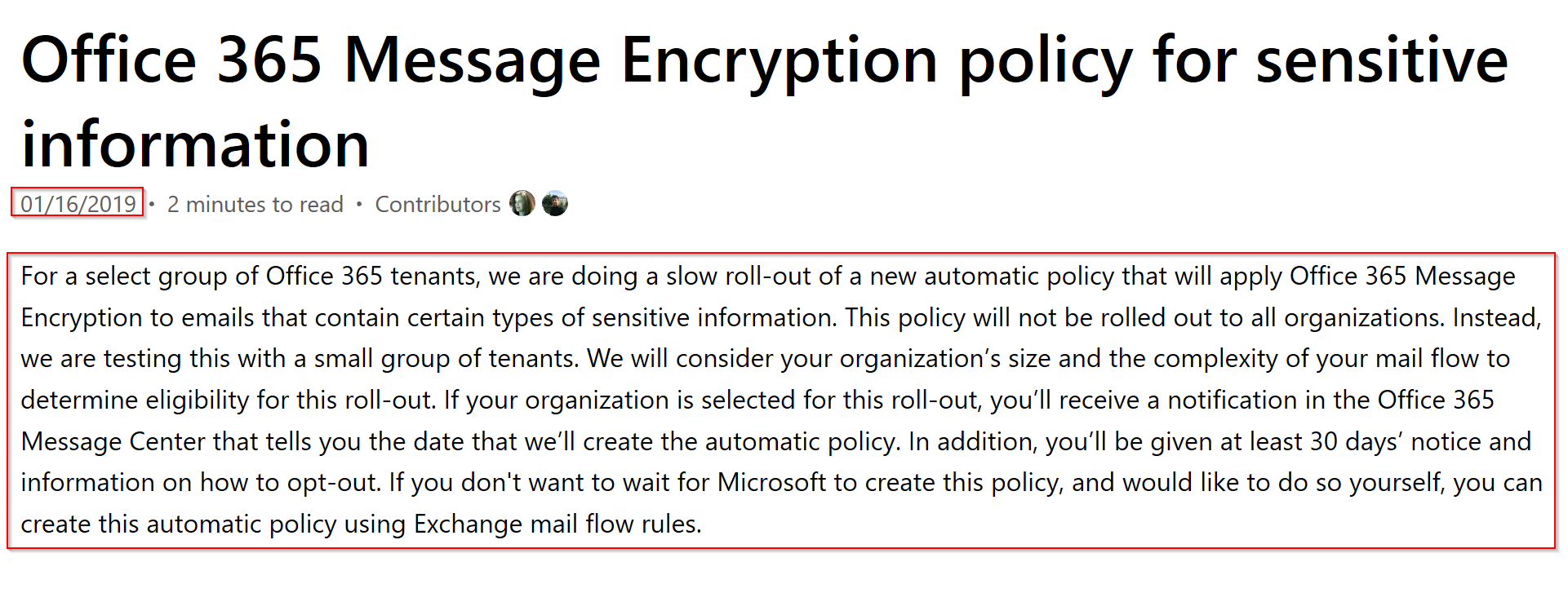 Last couple of weeks there have been several posts stating that Microsoft will add a transport rule to every Office 365 tenant to enable Office 365 Message Encryption (OME). For example: https://www.petri.com/microsoft-to-launch-automatic-email-encryption-office-365
